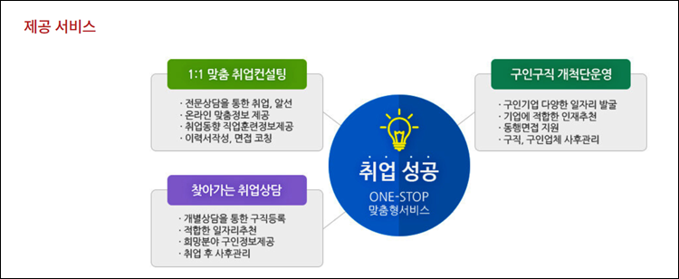 - 취업성공 ONE-STOP 맞춤형 서비스: 1:1 맞춤 취업 컨설팅(전문 상담을 통한 취업 알선, 온라인 맞춤 정보 제공, 취업 동향 직업 훈련 정보 제공, 이력서 작성 및 면접 코칭)