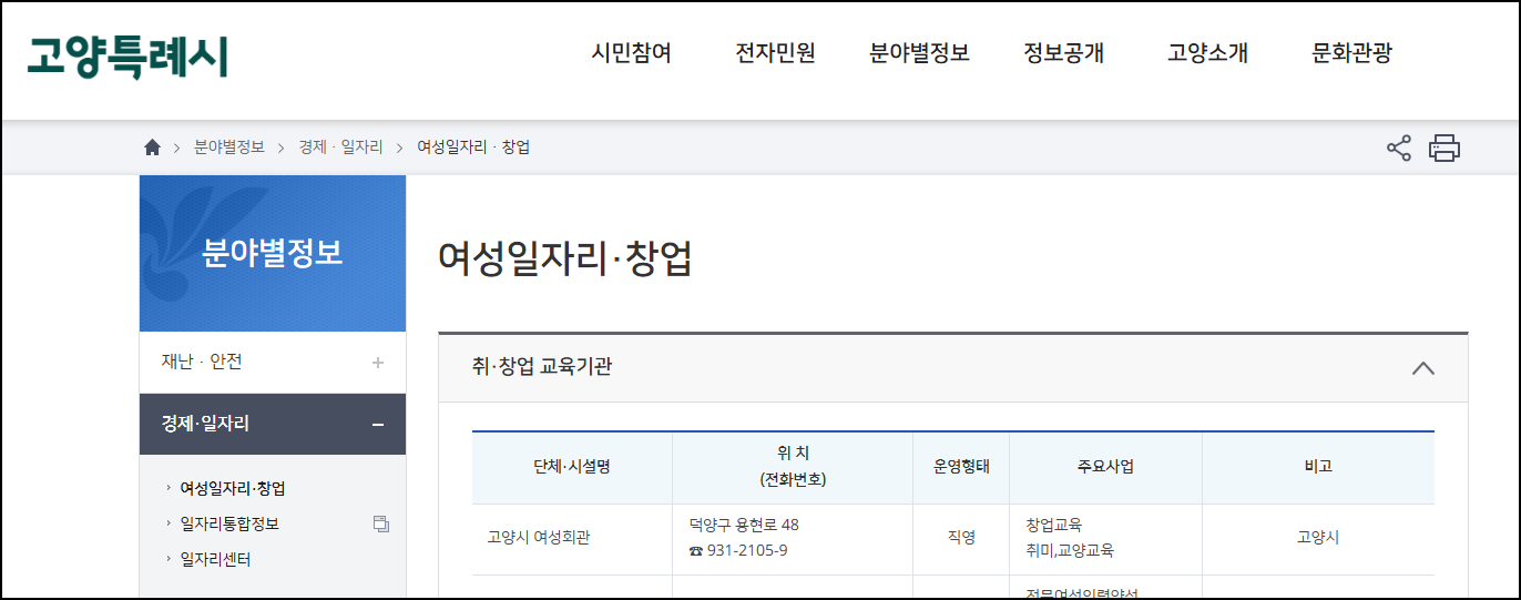 - 고양시 여성회관: 창업 교육 및 취미, 교양 교육 제공