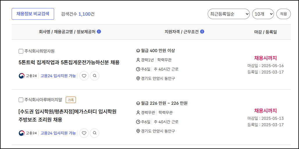 주식회사희망자원 | 5톤트럭 집게작업과 5톤집게운전가능하신분 채용 | 월급 400만원 이상 | 경기도 안양시 동안구 | 주 40시간 근로, 주 6일 | 2025-05-16 |