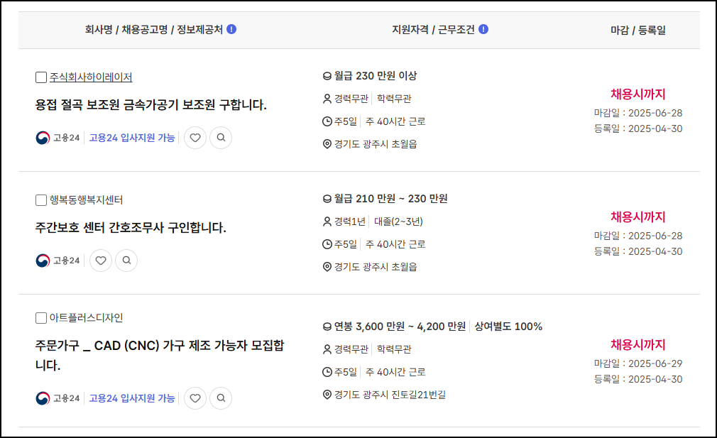 광주시일자리센터나 고용24에서 다양한 채용 정보를 확인하실 수 있습니다. 최근 채용 공고 중 일부는 아래와 같습니다.